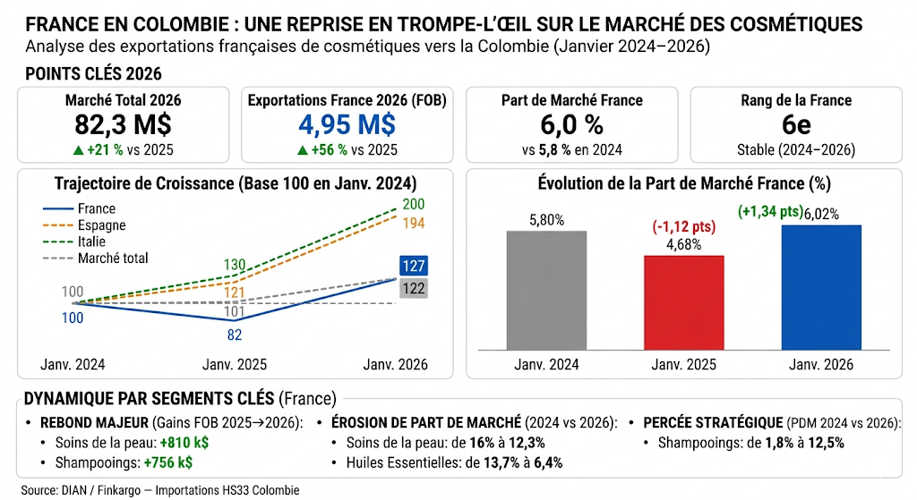 En janvier 2026, la France exporte 4,95 millions de dollars de cosmétiques vers la Colombie. Un rebond de 56 % en un an, après la chute de 2025. Les chiffres semblent bons. Et pourtant, ils ne le sont pas.